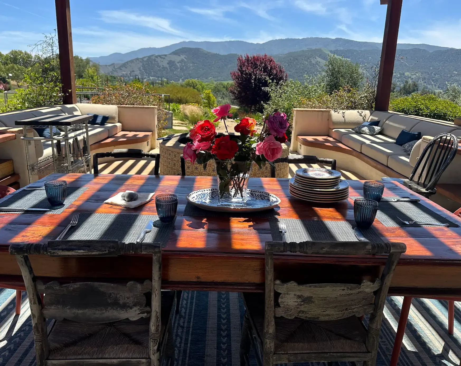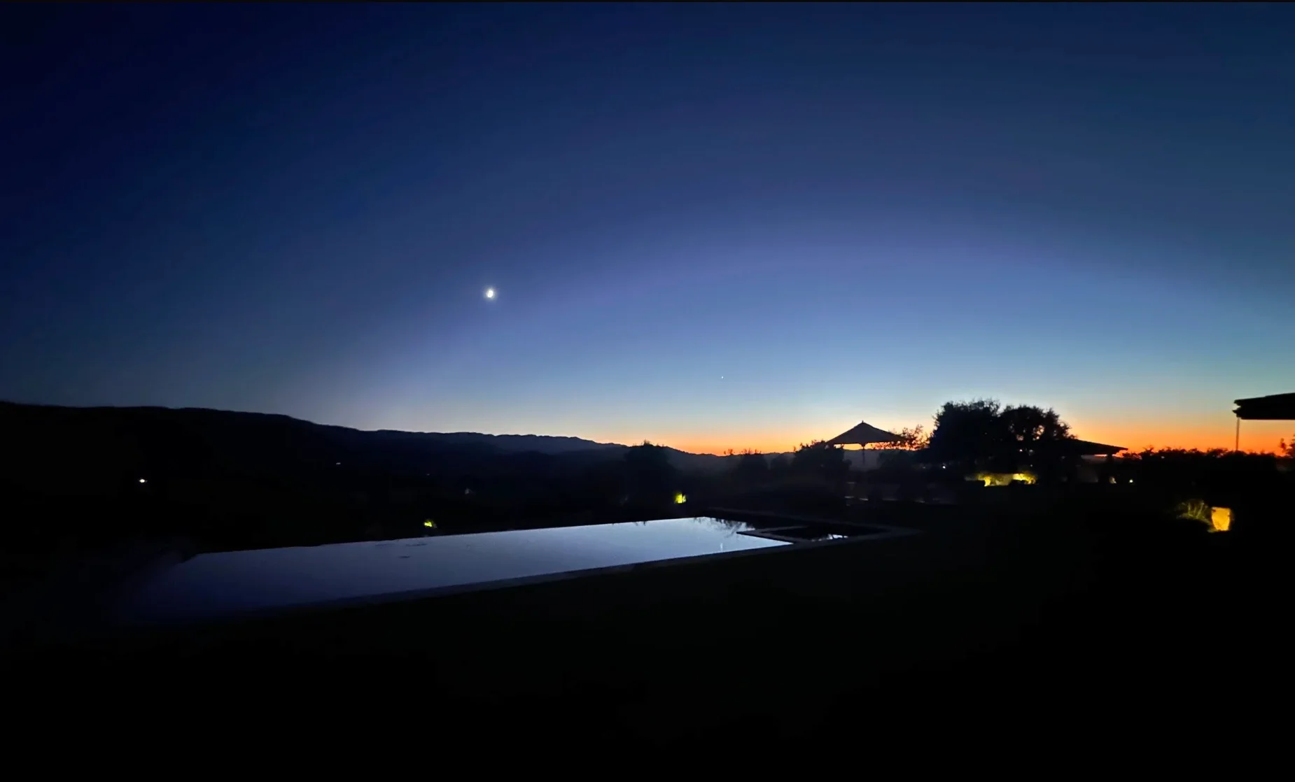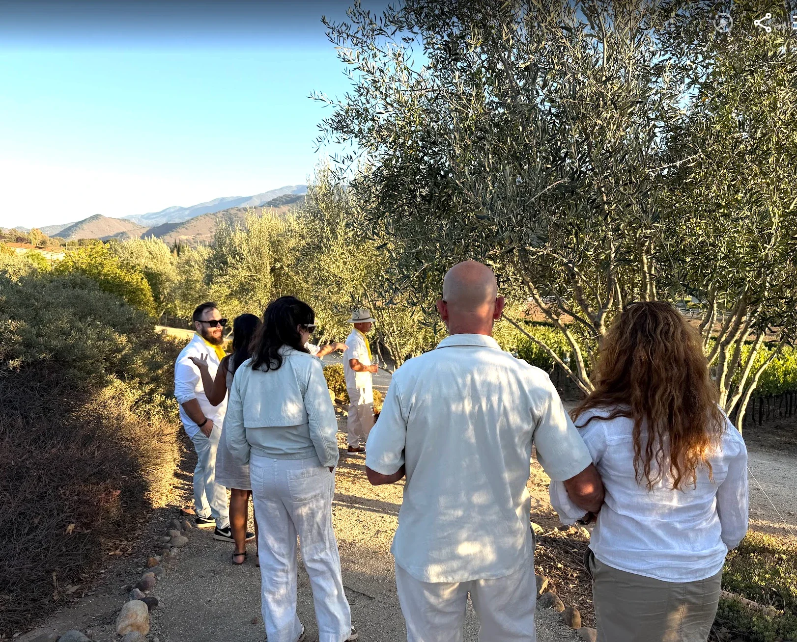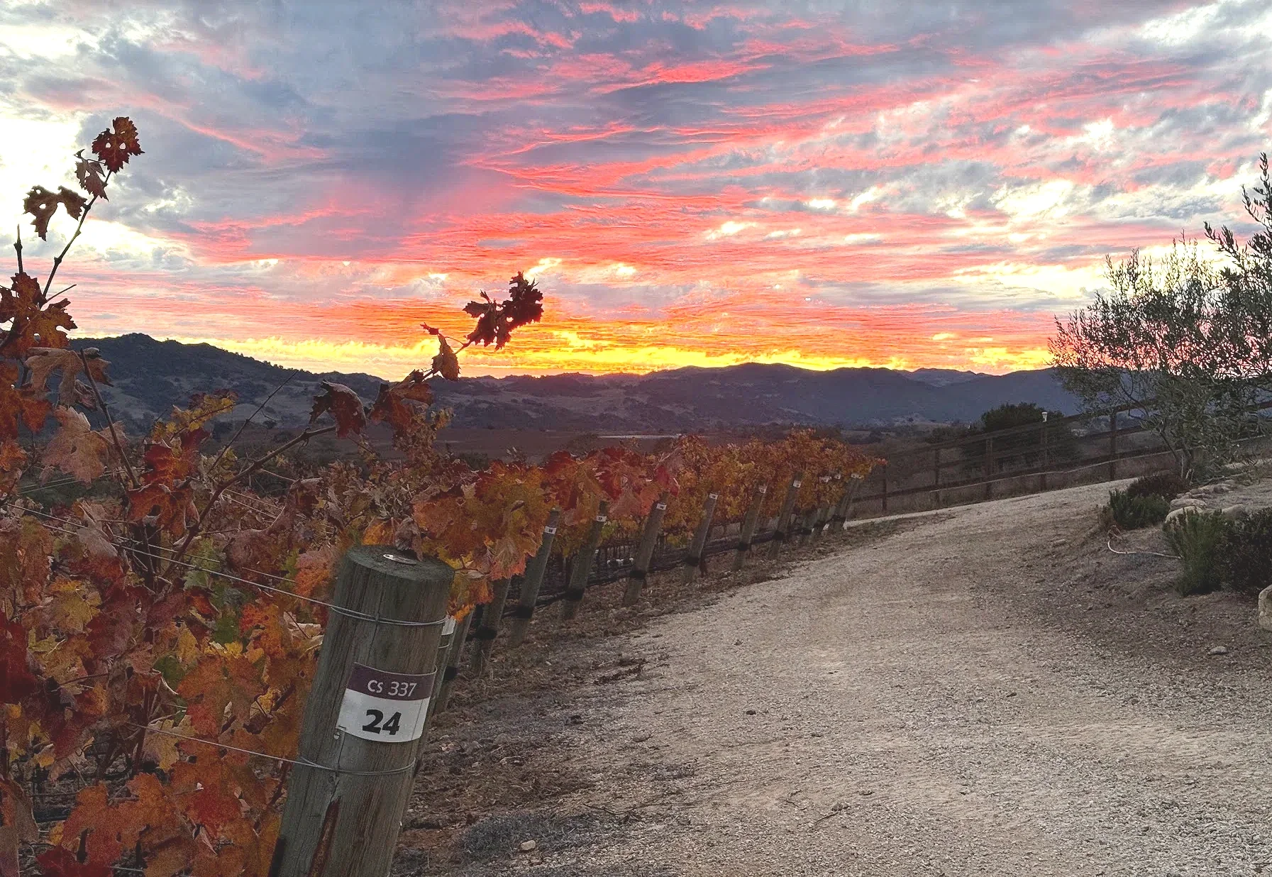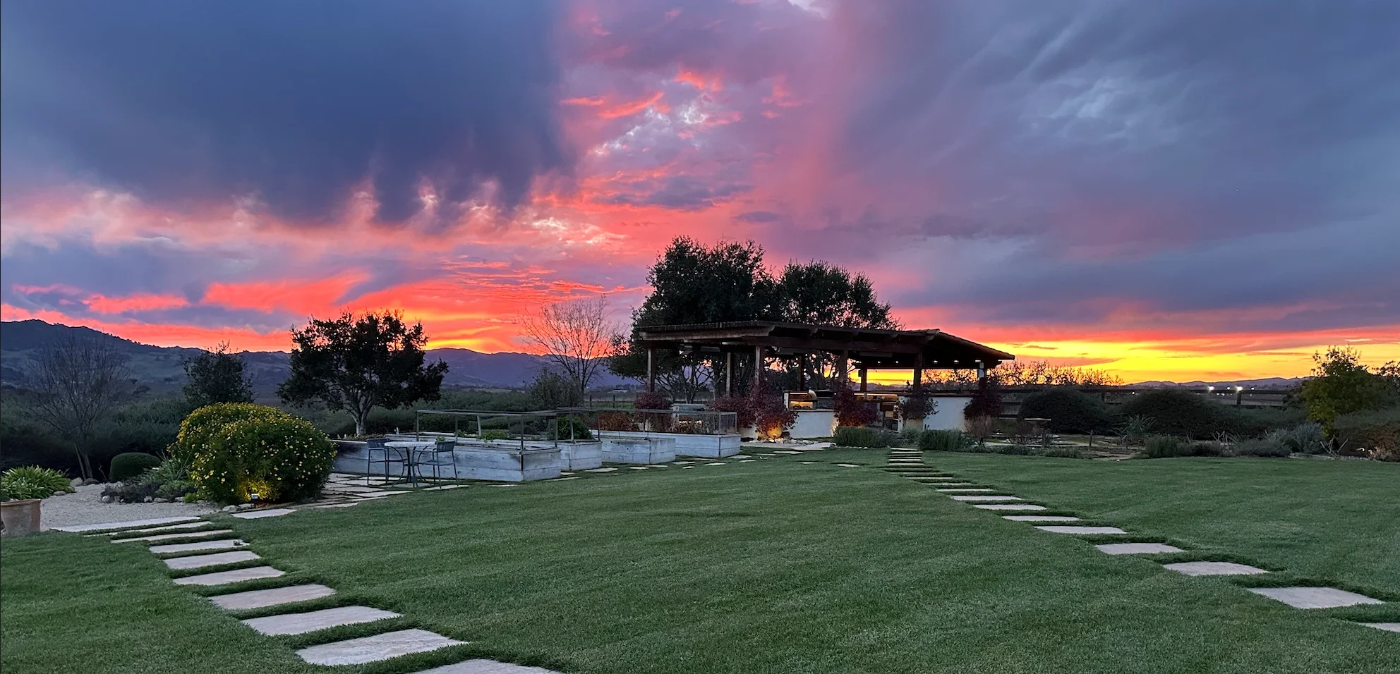 INÉSUENO vineyard pergola outdoor dining area at sunset with a paved walkway, green lawn, bushes, trees, and a wooden pergola structure.
