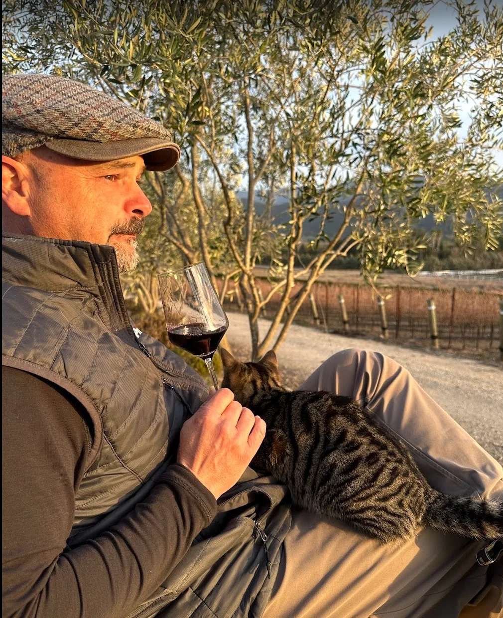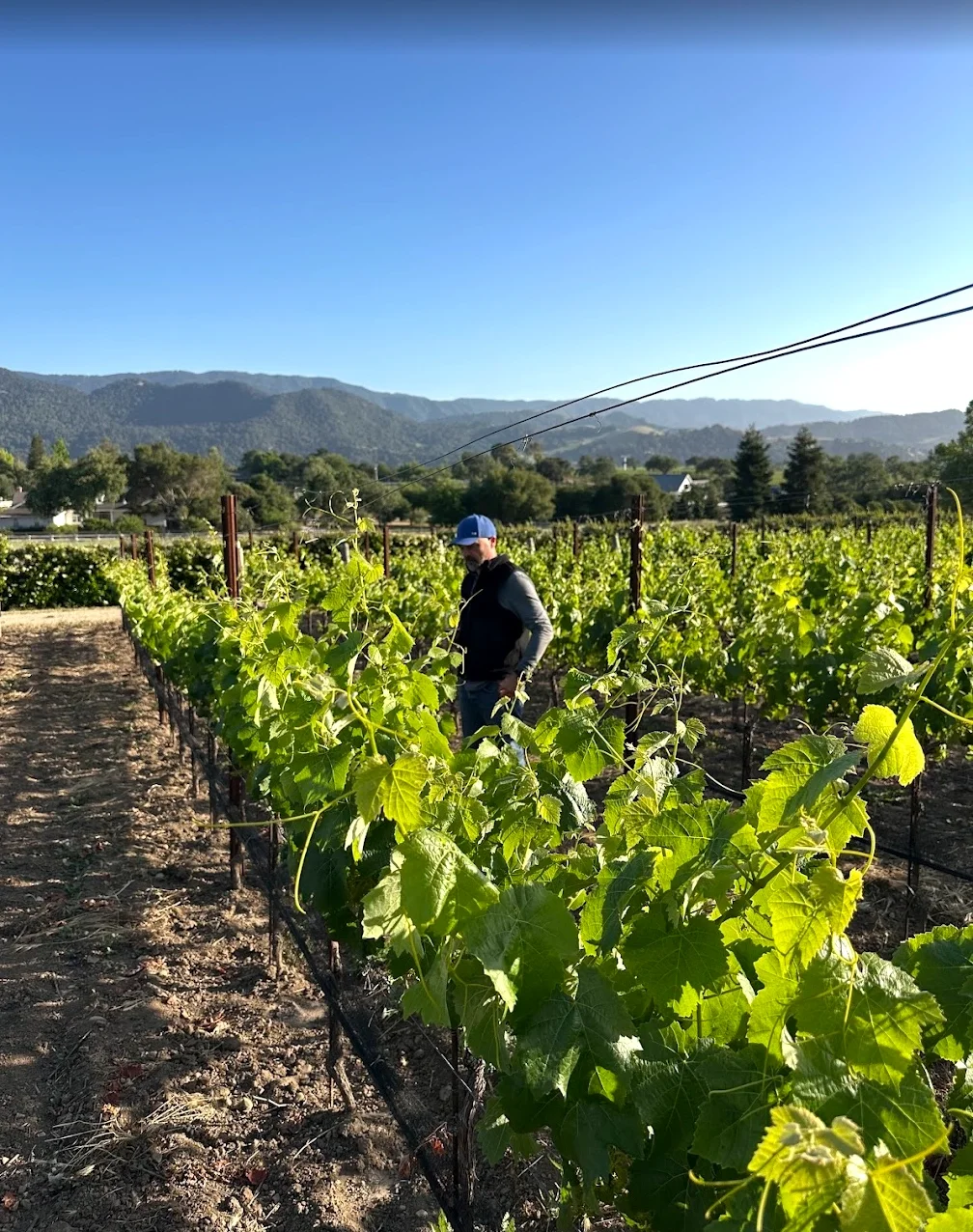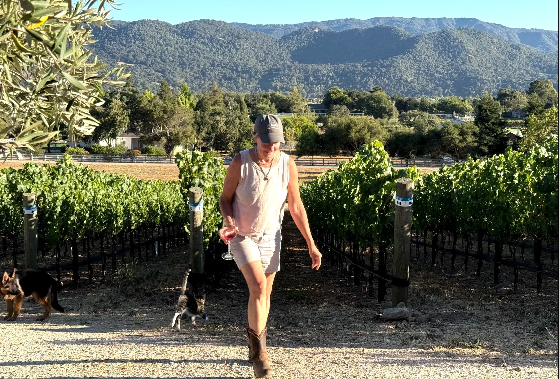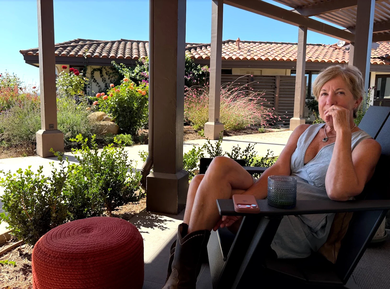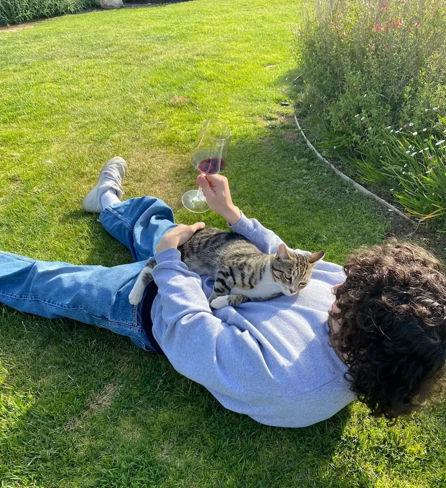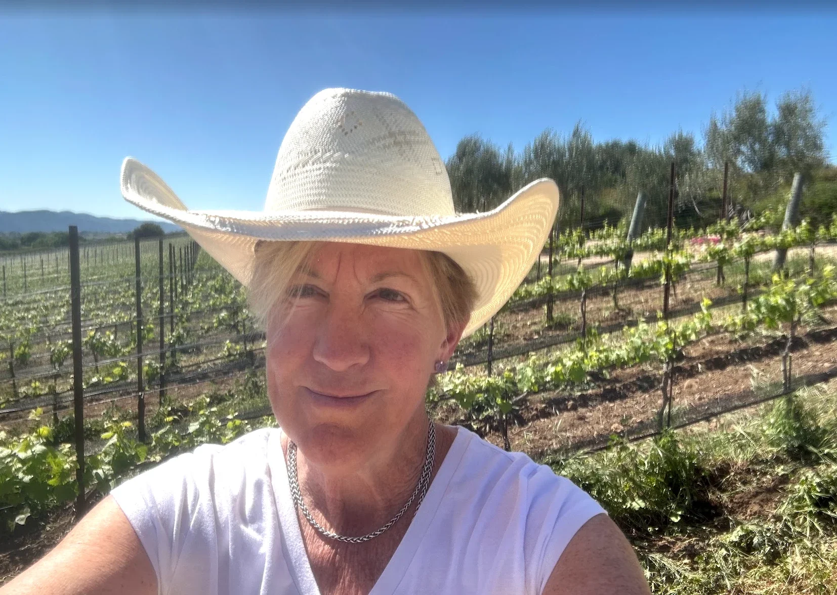 INÉSUENO vineyard pergola outdoor dining area at sunset with a paved walkway, green lawn, bushes, trees, and a wooden pergola structure.