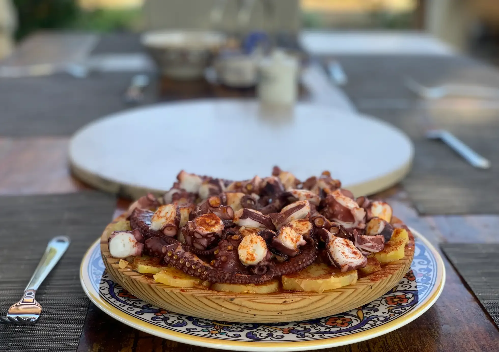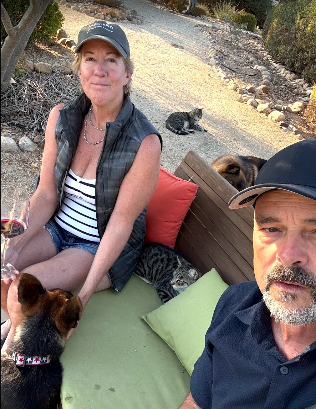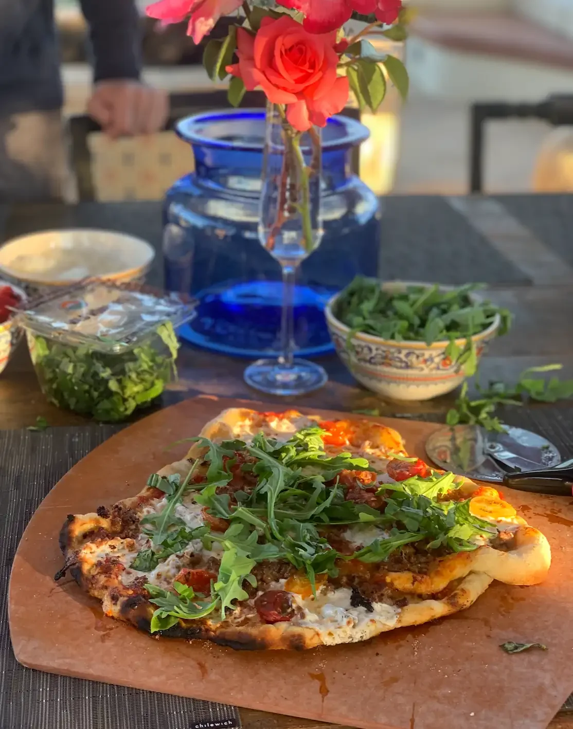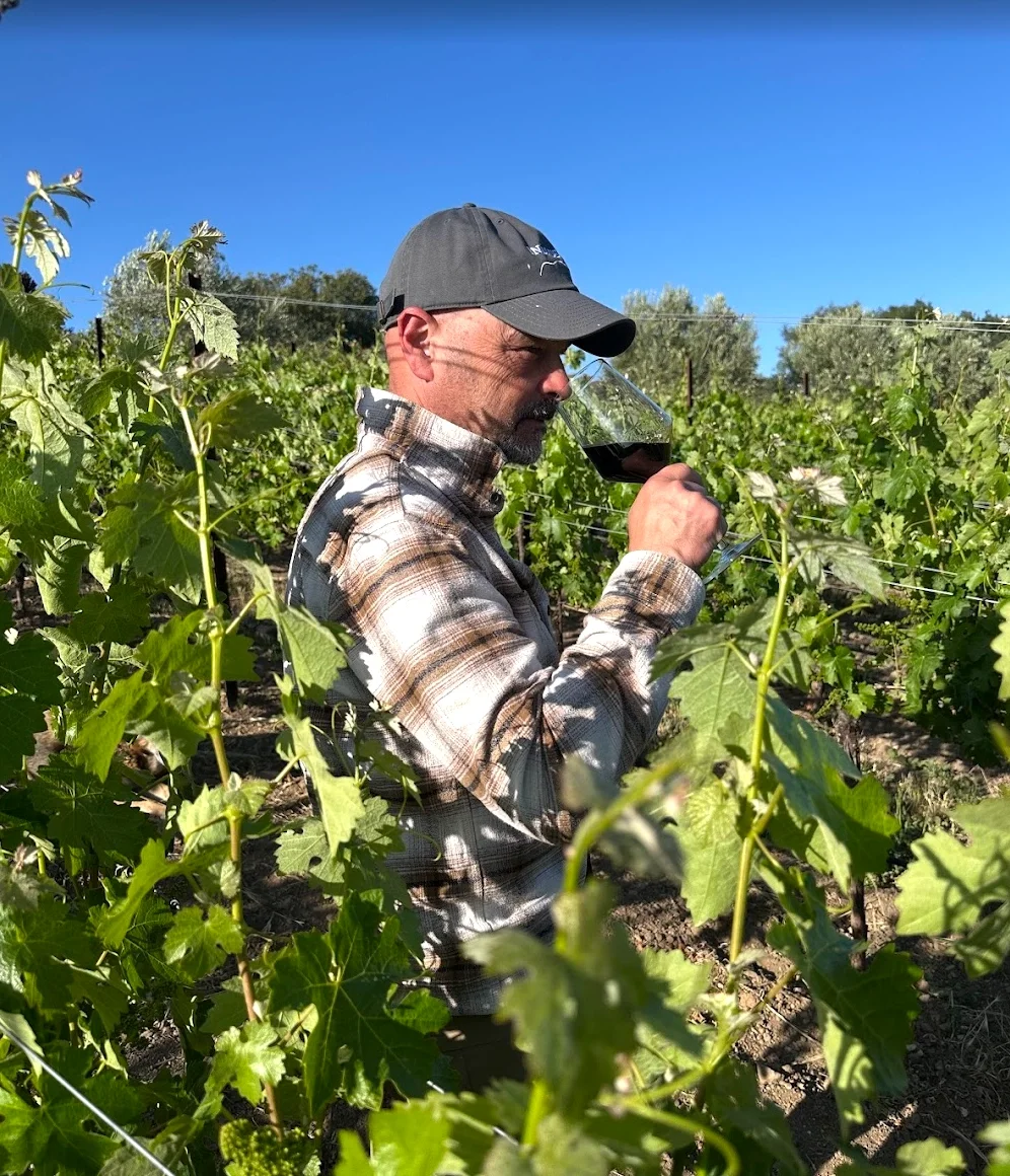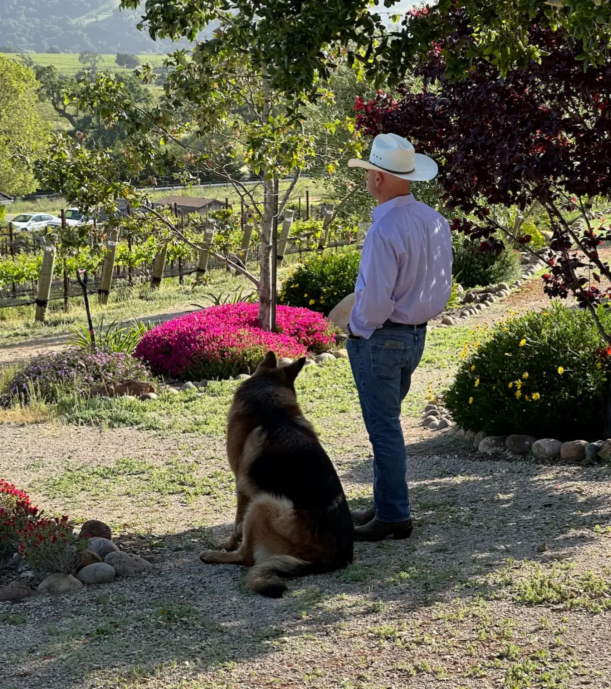 INÉSUENO vineyard pergola outdoor dining area at sunset with a paved walkway, green lawn, bushes, trees, and a wooden pergola structure.
